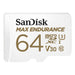 SanDisk Max Endurance 64 GB UHS-I Class 10 MicroSDXC Memory Card. Capacity: 64 GB, Flash card type: MicroSDXC, Flash memory class: Class 10, Internal memory type: UHS-I, Read speed: 100 MB/s, Write speed: 40 MB/s, UHS Speed Class: Class 3 (U3), Video Speed Class: V30. Protection features: Water resistant, Temperature proof, Product colour: White