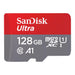SanDisk Ultra 128 GB UHS-I Class 10 MicroSDXC Memory Card. Capacity: 128 GB, Flash card type: MicroSDXC, Flash memory class: Class 10, Internal memory type: UHS-I, Read speed: 140 MB/s, UHS Speed Class: Class 1 (U1). Protection features: Water resistant, Temperature proof, Product colour: Red, Grey