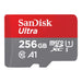 SanDisk Ultra. Capacity: 256 GB, Flash card type: MicroSDXC, Flash memory class: Class 10, Internal memory type: UHS-I, Read speed: 150 MB/s, UHS Speed Class: Class 1 (U1). Product colour: Grey, Red